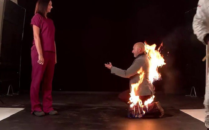 Nam diễn viên đóng thế để lửa cháy trên quần áo, đồng thời thực hiện màn cầu hôn có một không hai này.