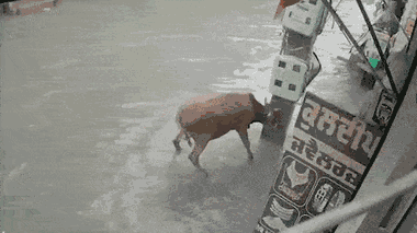 Một người đàn ông ở Mansa, Ấn Độ đã nhanh trí dùng chiếc khăn để giải cứu chú bò bị điện giật trên đoạn đường ngập nước.