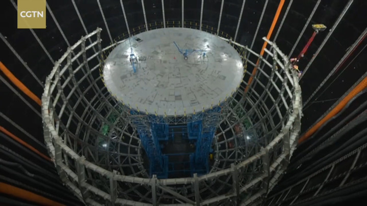 Các kỹ sư đang lắp ráp một cấu trúc hình cầu bằng nhựa plexiglass, nặng hơn 600 tấn tại đài quan sát dưới lòng đất TP Giang Môn, Trung Quốc.