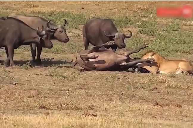 Thấy đồng loại bị sư tử cắn và có thể mất mạng, bầy trâu rừng lao tới tấn công kẻ săn mồi nhằm giải cứu cho chú trâu xấu số.
