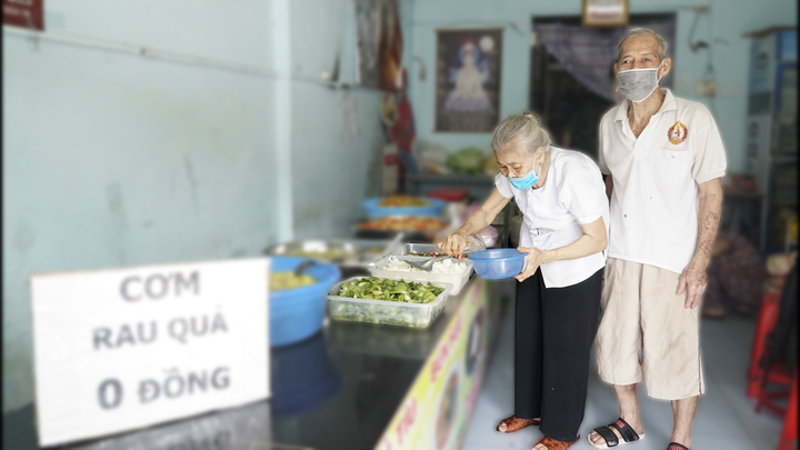 Hàng ngày, hai ông bà Nguyễn Thị My (70 tuổi) và Trần Văn Hồng (86 tuổi) thức dậy từ 3h để nấu cơm chay phục vụ miễn phí cho người khó khăn ở TP.HCM.