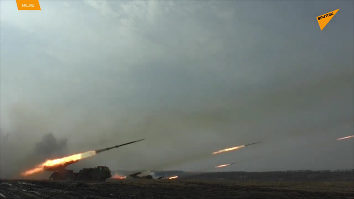 Một cuộc tập trận quy mô lớn diễn ra tại Primorye, Nga, lính pháo binh cùng sự hỗ trợ của phi đội trực thăng, tập trận bắn đạn thật tiêu diệt mục tiêu.