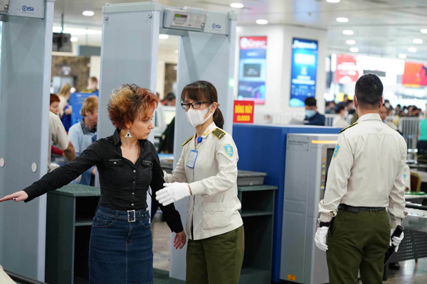 Nhân viên an ninh tại Nội Bài kiểm tra thân nhiệt khách nhập cảnh vào Việt Nam.