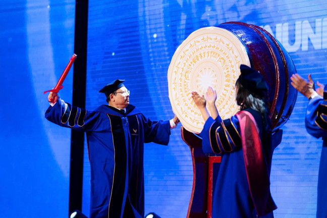 GS. Yap-Peng Tan đánh trống khai trường trong buổi Lễ khai giảng nhiệm kỳ đầu tiên của ông tại VinUni.