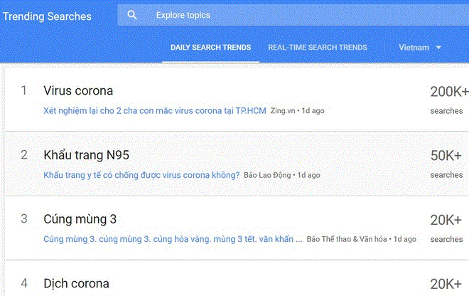 Corona trở thành một trong những từ khóa có lượt tìm kiếm cao nhất trên bảng xếp hạng Google Trends tại Việt Nam, Mỹ hay Canada.
