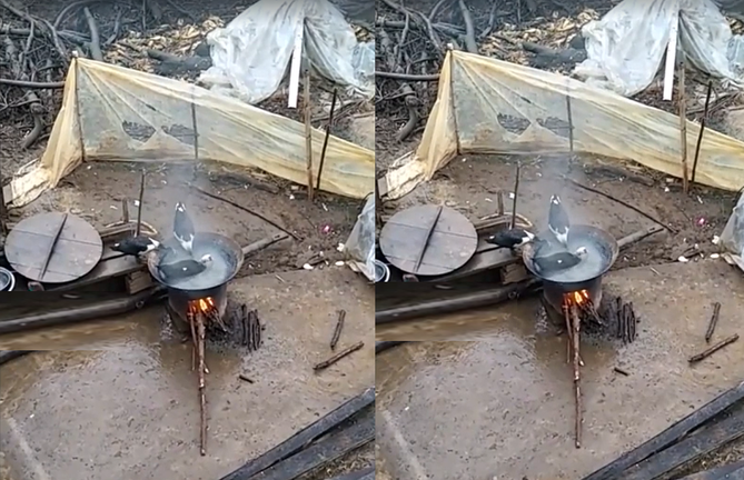 Vịt sợ rét, nằm 'phê pha' trong chảo nước đang đun