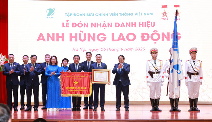 Thay mặt Lãnh đạo Đảng, Nhà nước, Thủ tướng Phạm Minh Chính trao Danh hiệu Anh hùng Lao động tặng Tập đoàn VNPT. (Ảnh: VNPT)