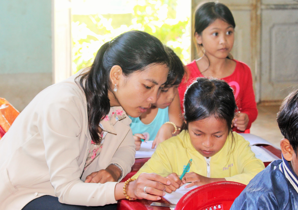 Từng nét chữ, từng phép tính, chị Mlê đều tỉ mẩn chỉ cho học trò.