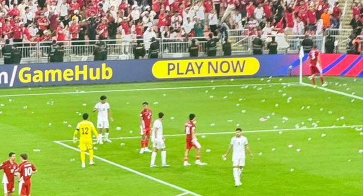 Sau một vài phút, trọng tài Ma Ning vẫn cho trận đấu tiếp tục. Nhưng chính các cầu thủ Indonesia phải tốn thời gian nhặt bỏ rác bij cổ động viên đội nhà ném xuống sân. Đội trưởng Jay Idzes phải tiến đến sát đường biên và ra dấu cho người hâm mộ xứ vạn đảo bình tĩnh hơn.