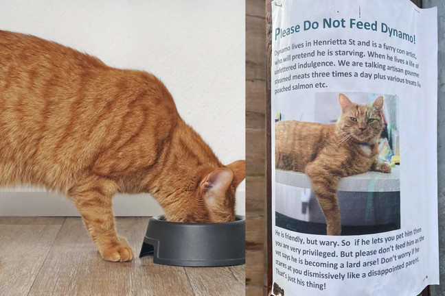 Mặc dù được chủ cho ăn ba lần mỗi ngày, mèo Dynamo vẫn đi dạo khắp khu dân cư tại Nottinghamshire (Anh), giả vờ như mình đang rất đói khát để giành đồ ăn nước uống miễn phí từ những người xung quanh.