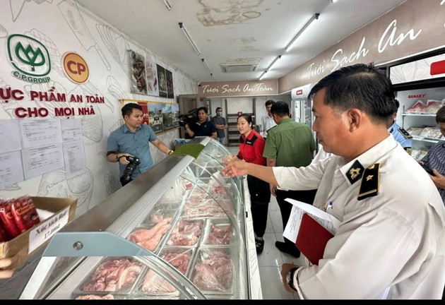 Cơ quan chức năng tiến hành kiểm tra cửa hàng thực phẩm C.P thuộc Công ty Cổ phần Chăn nuôi C.P. Việt Nam tại thị trấn Mỹ Xuyên, huyện Mỹ Xuyên. (Ảnh: Thạch Hồng/VOV-ĐBSCL)