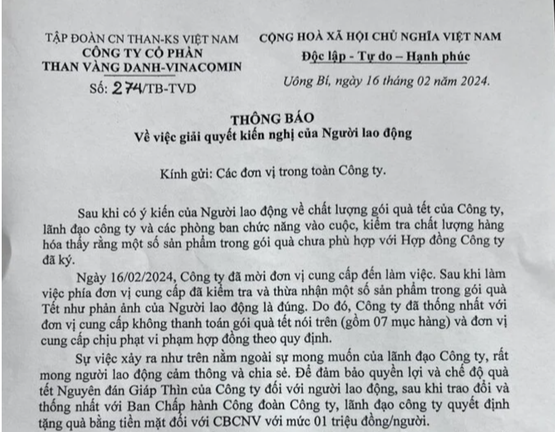 Thông báo của Công ty Cổ phần Than Vàng Danh nêu rõ một sản phẩm trong gói quà Tết tặng công nhân chưa phù hợp với hợp đồng công ty đã ký với đơn vị cung cấp.