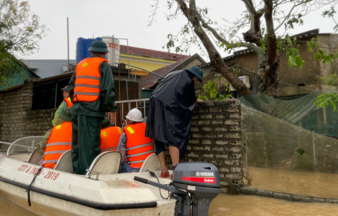 Lực lượng cứu hộ dùng xuồng máy vượt qua mưa lớn, bão lũ vượt sông Lam đến tiếp tế cho những người dân tại xã Lam Thành.