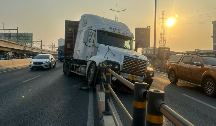 Ô tô đầu kéo va vào dải phân cách trên cầu Sài Gòn khiến kẹt xe, ùn ứ kéo dài.