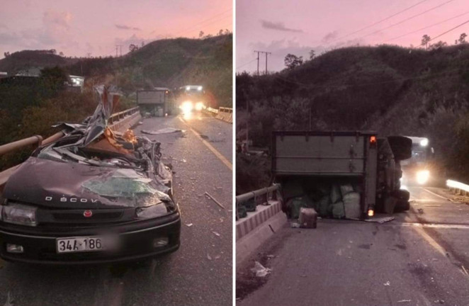 Khi đi tới Km1431+127, đoạn qua thôn Đăk Nớ (xã Đăk Pét, huyện ĐăkGlei, tỉnh Kon Tum), xe tải bất ngờ bị lật nghiêng, đè trúng ô tô 5 chỗ BKS: 34A - 186.45 do anh Nguyễn Văn Tánh (37 tuổi, trú thị trấn Đăk Glei, huyện Đắk Glei) cầm lái theo hướng ngược lại, trên xe chở theo vợ và 2 con trai.