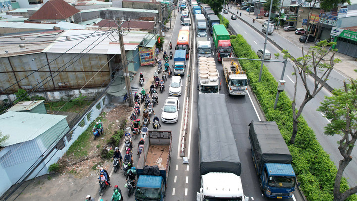 Xe tải tông nhau lật ngang trên đường, giao thông ùn tắc kéo dài 2km tại TP.HCM