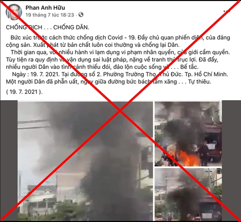 Theo Sở TT&TT TP.HCM, từ chiều 19/7, trên mạng xã hội Facebook xuất hiện và lan truyền hình ảnh một người đàn ông trung niên tự thiêu trên địa bàn phường Trường Thọ, TP Thủ Đức và kèm bình luận: “Bức xúc vì cách thức chống dịch COVID-19… người dân phẫn uất ngay giữa đường bức bách, tự thiêu”.