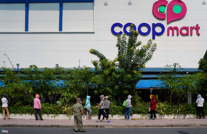 Tại siêu thị Co.opmart trên đường Nguyễn Kiệm (quận Phú Nhuận) từ sáng sớm đã có hàng chục người xếp hàng chờ sẵn để được vào mua sắm. Đến 9h, hàng trăm người dân xếp hàng dài 1 km vào tận các hẻm.