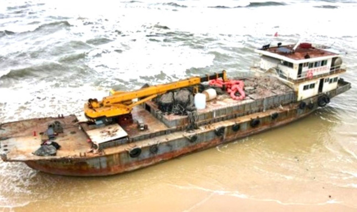 Tàu sắt lớn không có người trôi dạt vào bờ biển thôn 7, xã Triệu Vân, huyện Triệu Phong, tỉnh Quảng Trị.