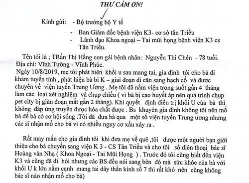 Chị Trần Thị Hằng (Vĩnh Phúc) viết thư cảm ơn Bộ trưởng Y tế, y bác sĩ Bệnh viện K (Tân Triều) vì tận tình cứu giúp mẹ chị là bà Nguyễn Thị Chén (78 tuổi).